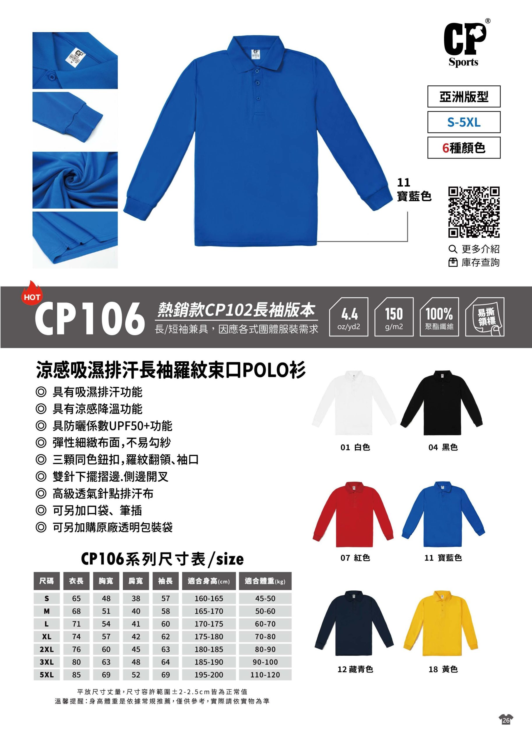 具吸濕排汗、涼感降溫與 UPF50+ 防曬三大機能,是 CP102 的長袖升級版,因應室外活動、防曬需求與多元團體服裝使用。